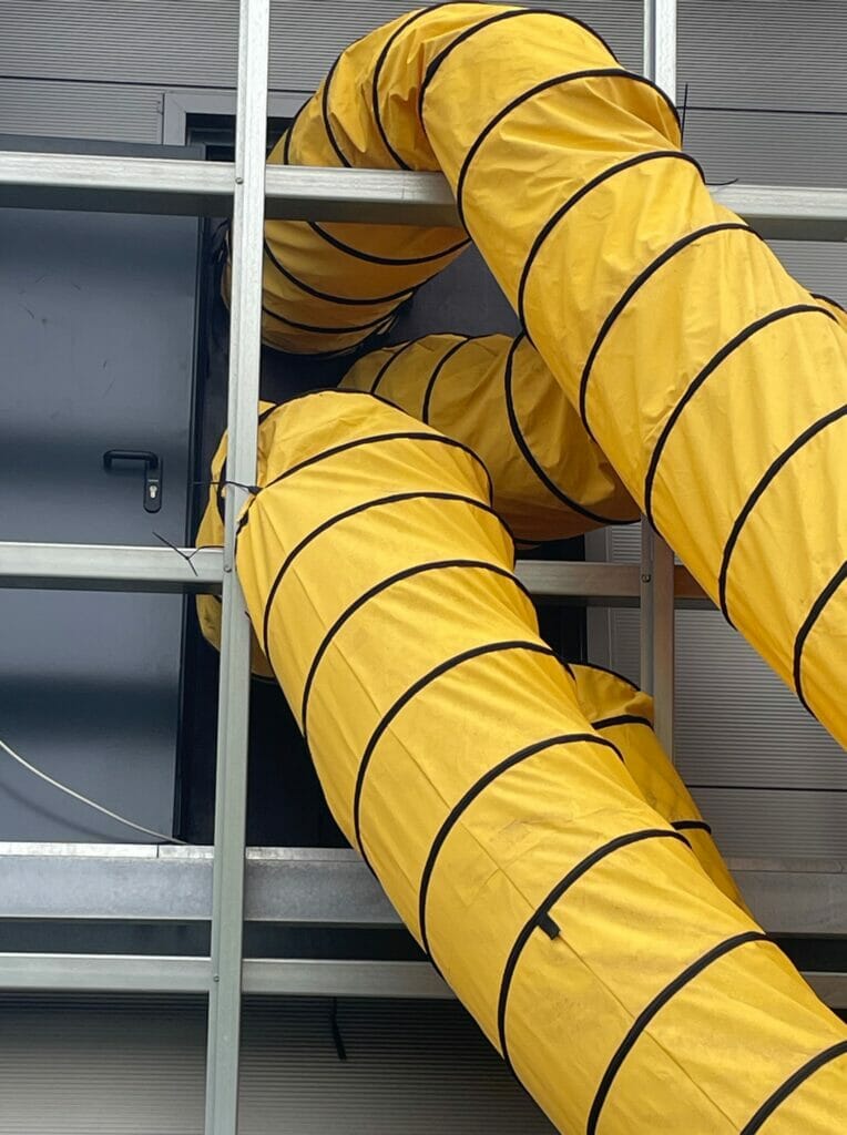 Ist ein stationäres Kaltwassernetz vorhanden, lassen sich Air Handler bzw. mobile Luftkühler auch an dieses anschließen. Möglich ist das mit flexiblen Schläuchen, die zentral heruntergekühltes Wasser zu den mobilen Lüftungsgeräten leiten.